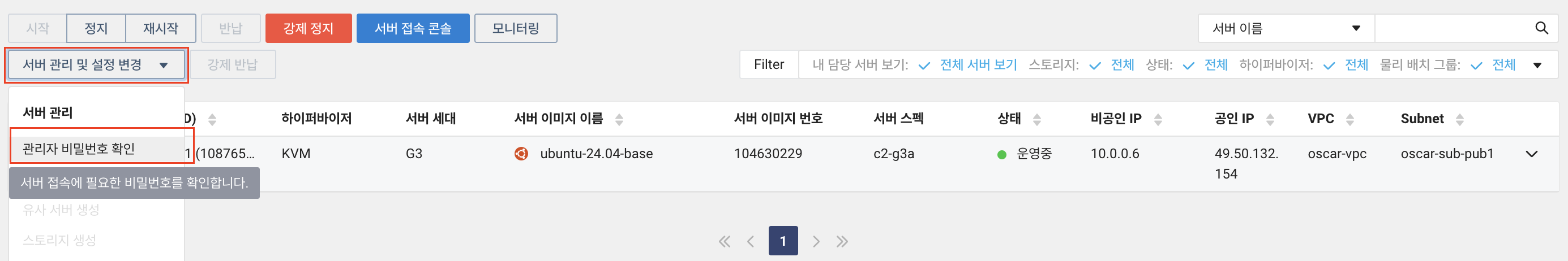 생성된 서버를 선택하고 서버 관리 및 설정 변경 메뉴를 선택하고 관리자 비밀번호 확인을 클릭한다.