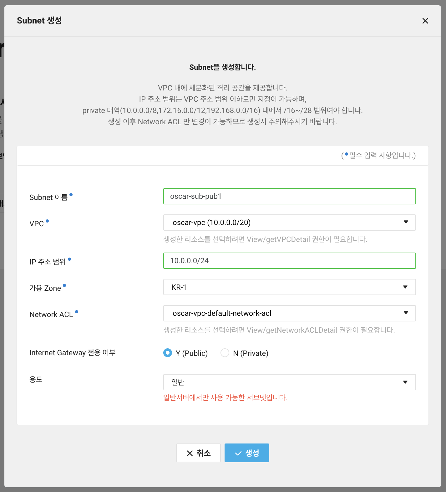 Subnet 생성을 누르고 원하는 조건으로 설정을 진행한다.