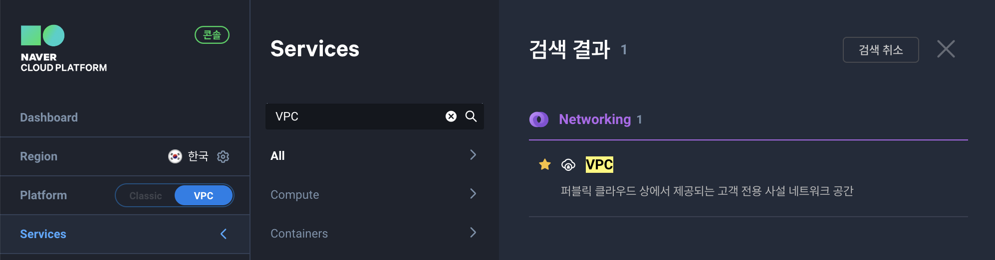 왼쪽 메뉴에서 서비스를 누른 뒤, 검색을 통해 VPC 탭으로 이동한다.
