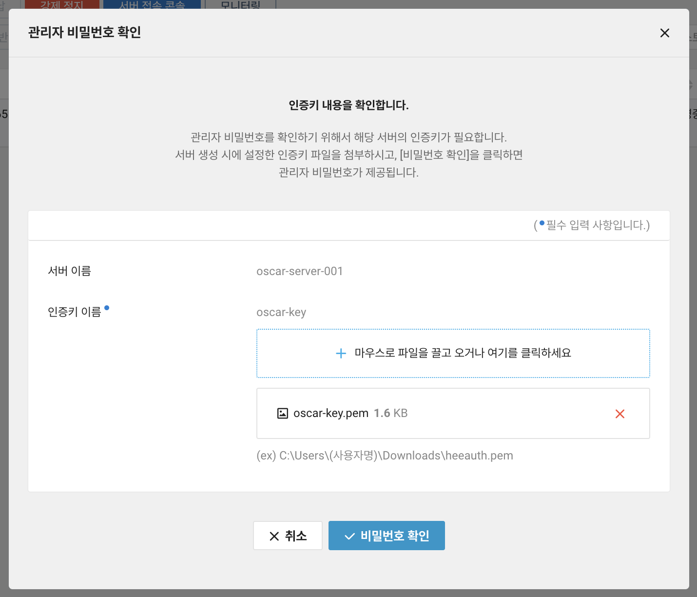서버 생성에 사용한 키를 선택하고 비밀번호 확인을 클릭하면 접속 비밀번호를 확인할 수 있다.