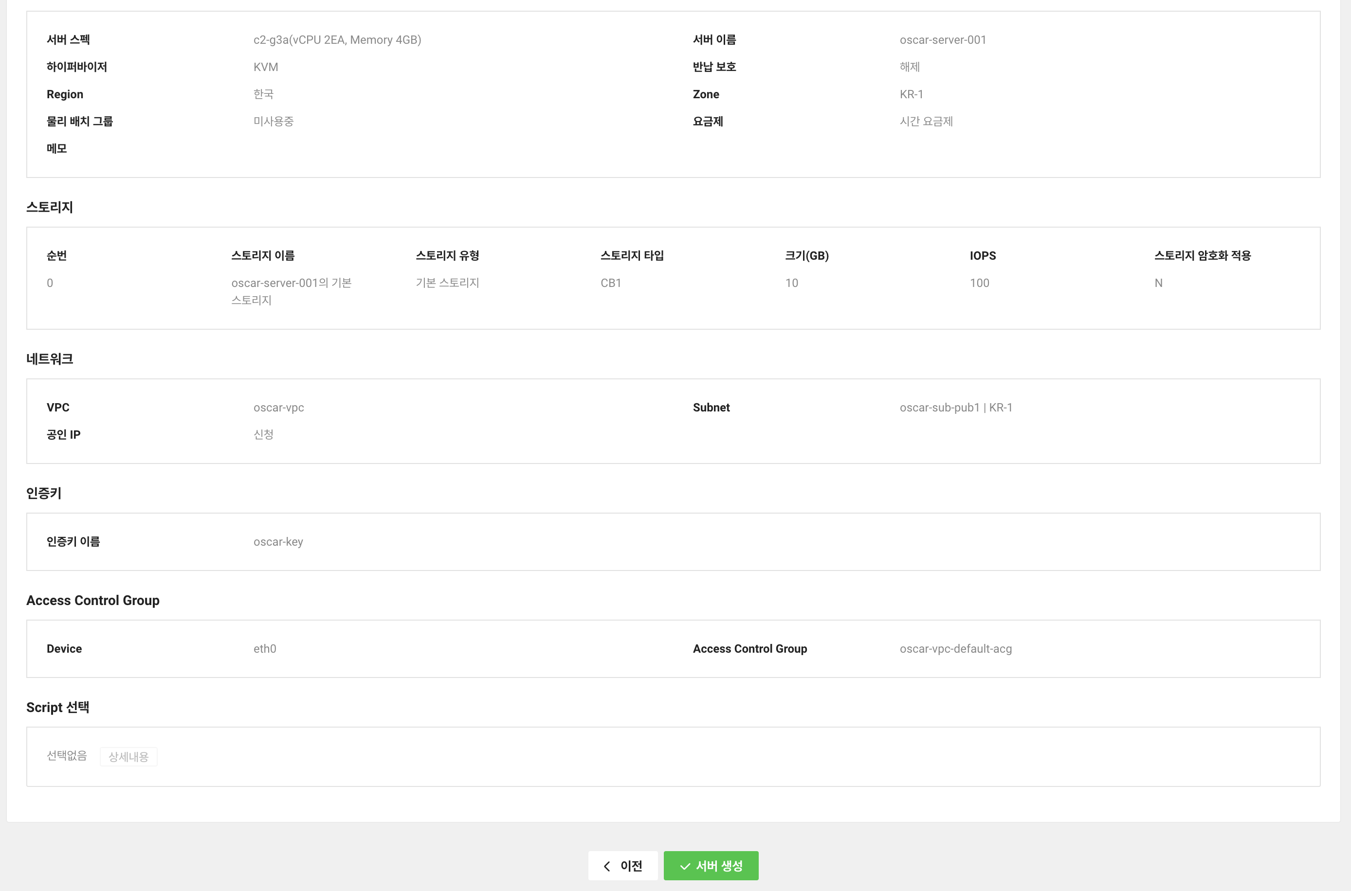 최종적으로 설정내용을 확인하고 서버 생성을 누른다.
