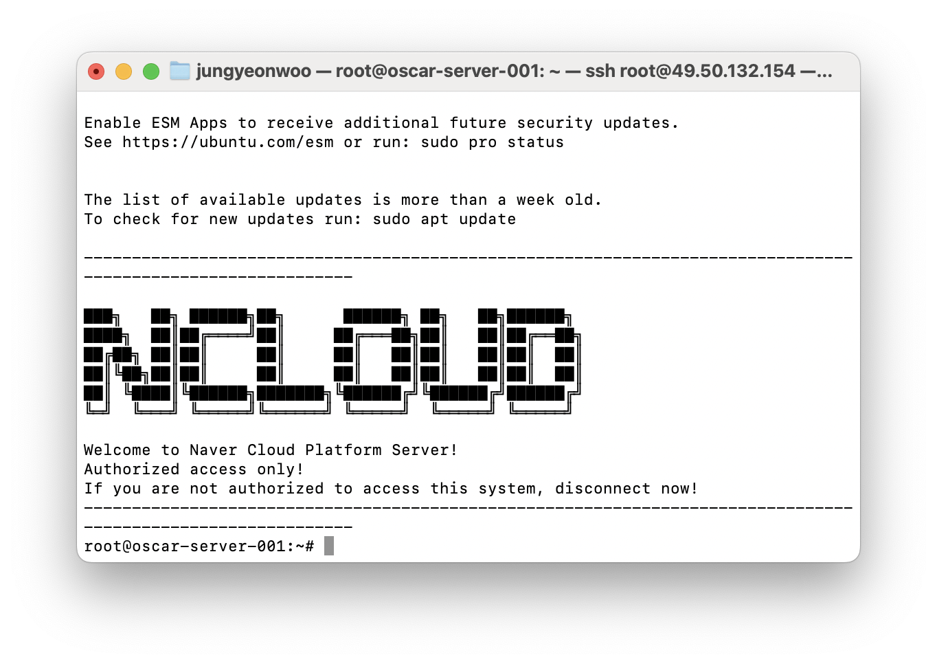 사용하고 있는 원격접속 프로그램(mac의 경우 터미널의 ssh, 윈도우의 경우 putty 등)으로 서버에 접속한다.
