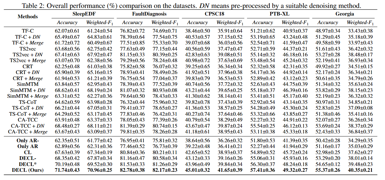 • 따라서 본 논문에서는 시계열 데이터의 표현에 존재하는 노이즈를 완화하고 모든 sample에 대해 적합한 노이즈 제거 방법을 자동으로 선택하는 Denoising-aware Contrastive Learning (DECL)을 제안함