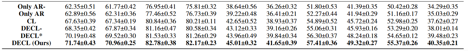 • 또한, DECL은 다른 SSL 방법보다 우수한 성능을 달성하며 이는 본 논문의 방법인 DECL이 적절한 Denoising 방법을 활용하여 노이즈를 완화하고 Representation learning을 수행하기 때문임