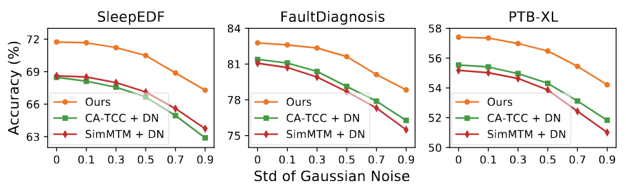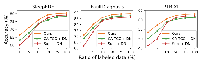 • 예를 들어, ECG 데이터셋인 PTB-XL에는 상당한 고주파 노이즈를 포함하고 있으며 기존의 시계열 SSL 기법인 CA-TCC를 적용시키면 상당히 낮은 분류 정확도를 보임. 반면 LOESS와 같은 적절한 Denoising 기법을 작용하면 정확도가 크게 향상됨을 위 그림을 통해 볼 수 있음