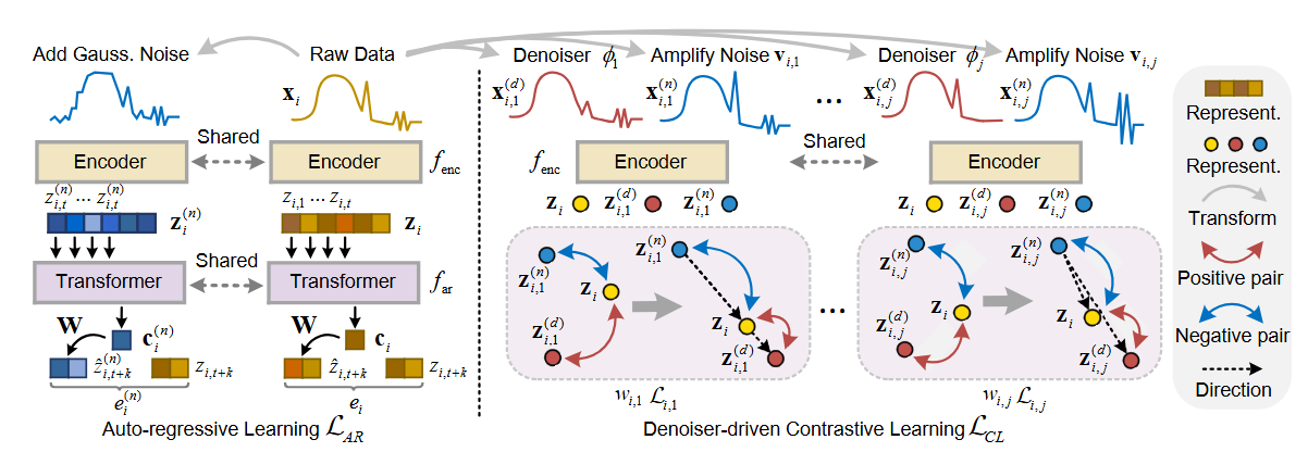 • 이를 극복하기 위해 본 논문에서는 DECL을 제안함. 특히, 두 가지 새로운 설계를 포함하는 데 첫 번째로 Auto-regressive encoder를 기반으로 noise를 완화하기 위한 새로운 Denoiser-driven contrastive learning objective를 제안함. 이는 Raw time series에 기존의 Denoiser를 적용하여 positive sample을 생성하고 이어서 contrastive learning objective를 사용하여 최적화를 통해 표현이 positive sample과 가까워지도록 유도하고 negative sample로부터 멀어지도록 하여 noise를 줄이는 전략을 사용함.