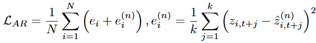 • 이후, Auto-regressive learning 처럼 fARf_{AR}에 집어넣어서 context vector와 예측치를 얻고 아래와 같은 loss로 학습이 수행됨. 이러한 Loss를 통해 예측 과정에서 노이즈가 섞인 시계열의 Global pattern을 파악하며, 이는 raw data에 과적합되는 것을 방지함.
