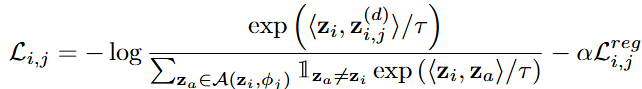 • zi,j(n)z^{(n)}_{i,j}zi,j(d)z^{(d)}_{i,j}는 각각 xi,j(n)x^{(n)}_{i,j}xi,j(d)x^{(d)}_{i,j}의 표현이며, 대조 학습 시에 각각 negative sample과 positive sample로 간주됨. 그럼 다음 ziz_i를 anchor로 삼아서 anchor를 positive sample과 가까워지게 만드는 동시에 laten space 상에서 negative sample로 부터 멀리 밀어내도록 학습됨