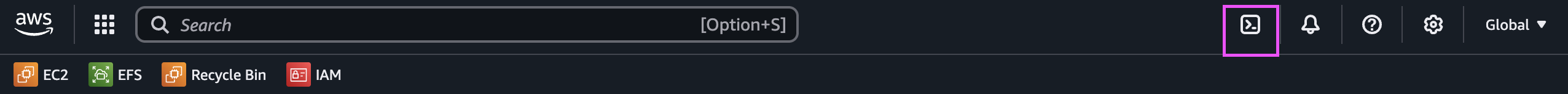 로컬에 아무것도 설치하지 않아도 AWS CLI v2와 여러 도구가 미리 설치되어 있고, 콘솔에 로그인한 자격증명이 자동으로 적용된 상태로 시작
