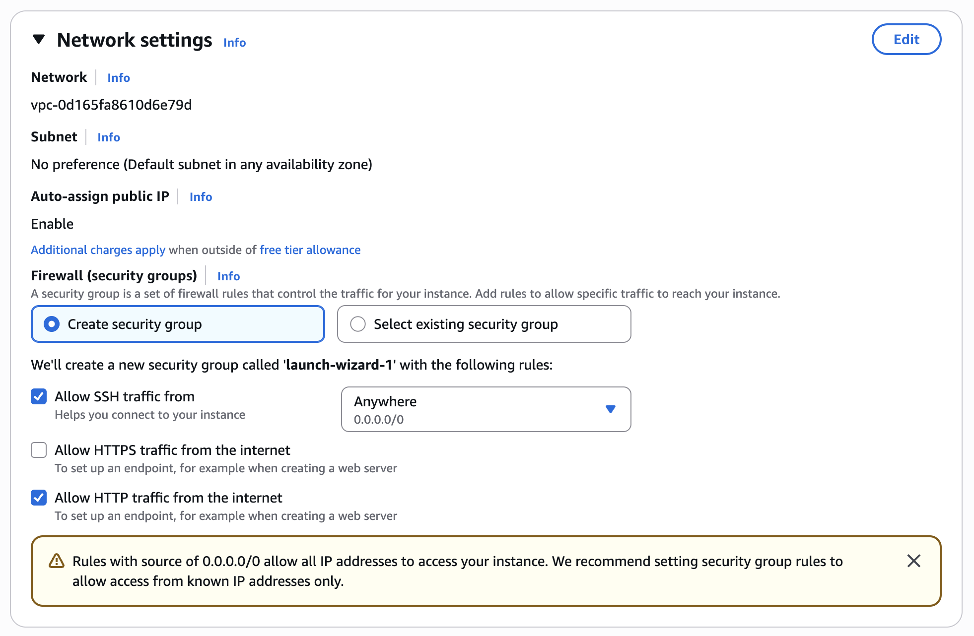 보안그룹은 생성할 수도, 이미 존재하는 그룹에서 선택할 수도 있다..!