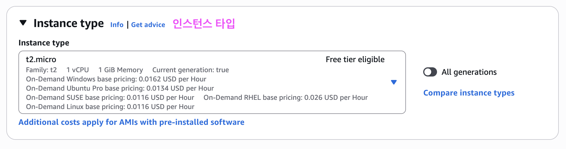 인스턴스 타입은 CPU 수, 메모리 용량, 비용에 따라 달라짐
