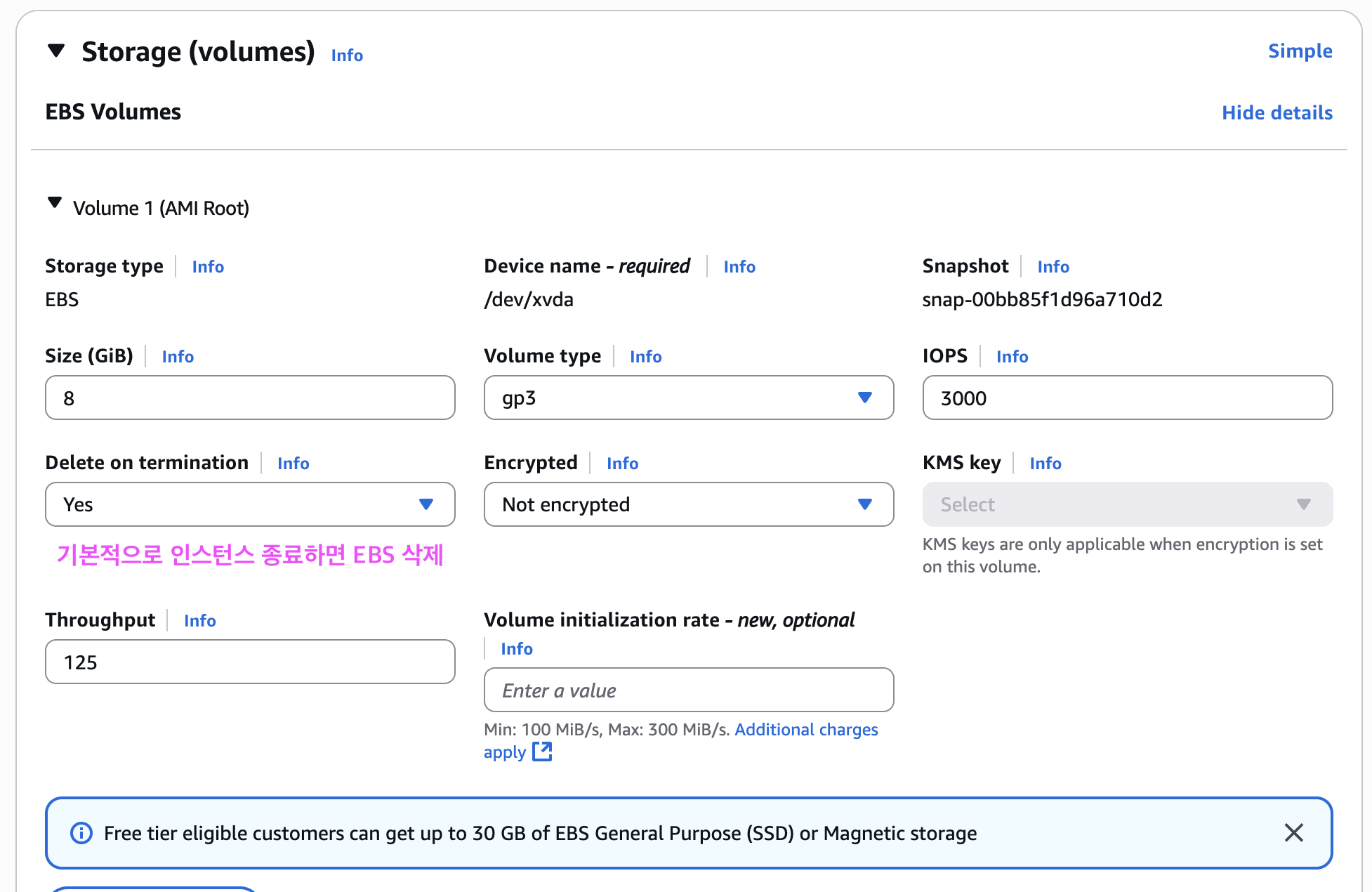 • EBS => 네트워크로 붙는 블록 스토리지(영구). 타입(gp3/io1…)·용량·암호화·“종료 시 삭제” 등을 설정