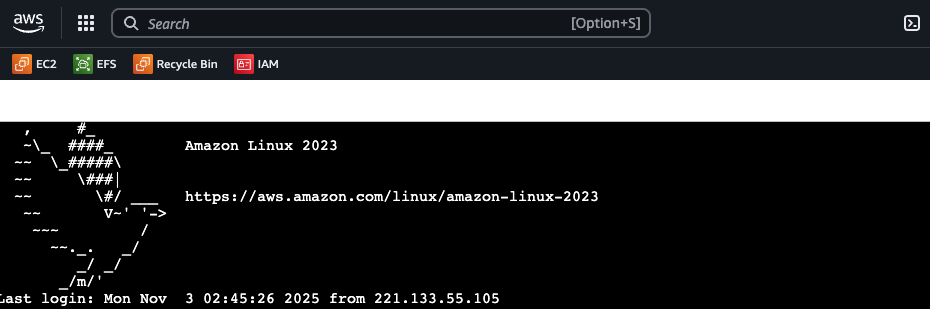 재진입 => ssh -i EC2Tutorial.pem(키 파일 이름) ec2-user@${Public IPv4 주소}