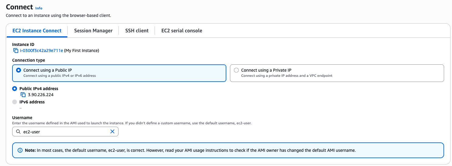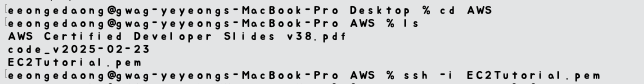 .pem 파일이 있는 경로로 가서 ssh -i EC2Tutorial.pem ec2-user@${Public IPv4 주소} 실행