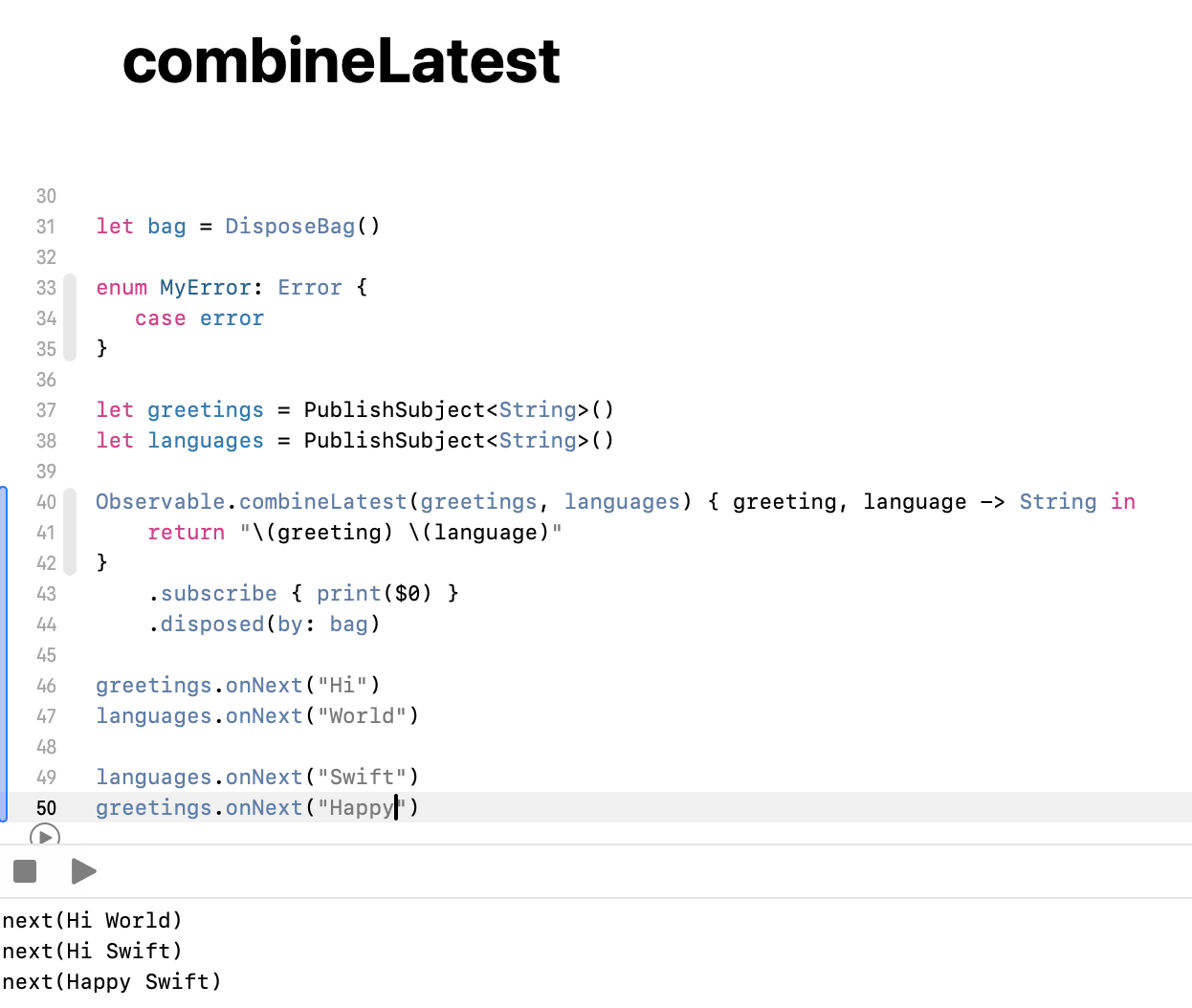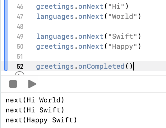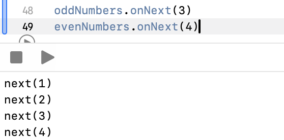 - 이후 각 옵저버블에 next이벤트를 전달하더라도 하나의 옵저버블이 전달한것으로 된다.