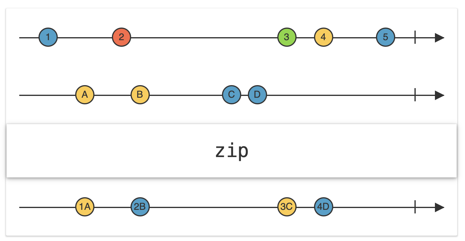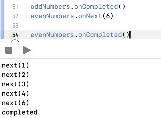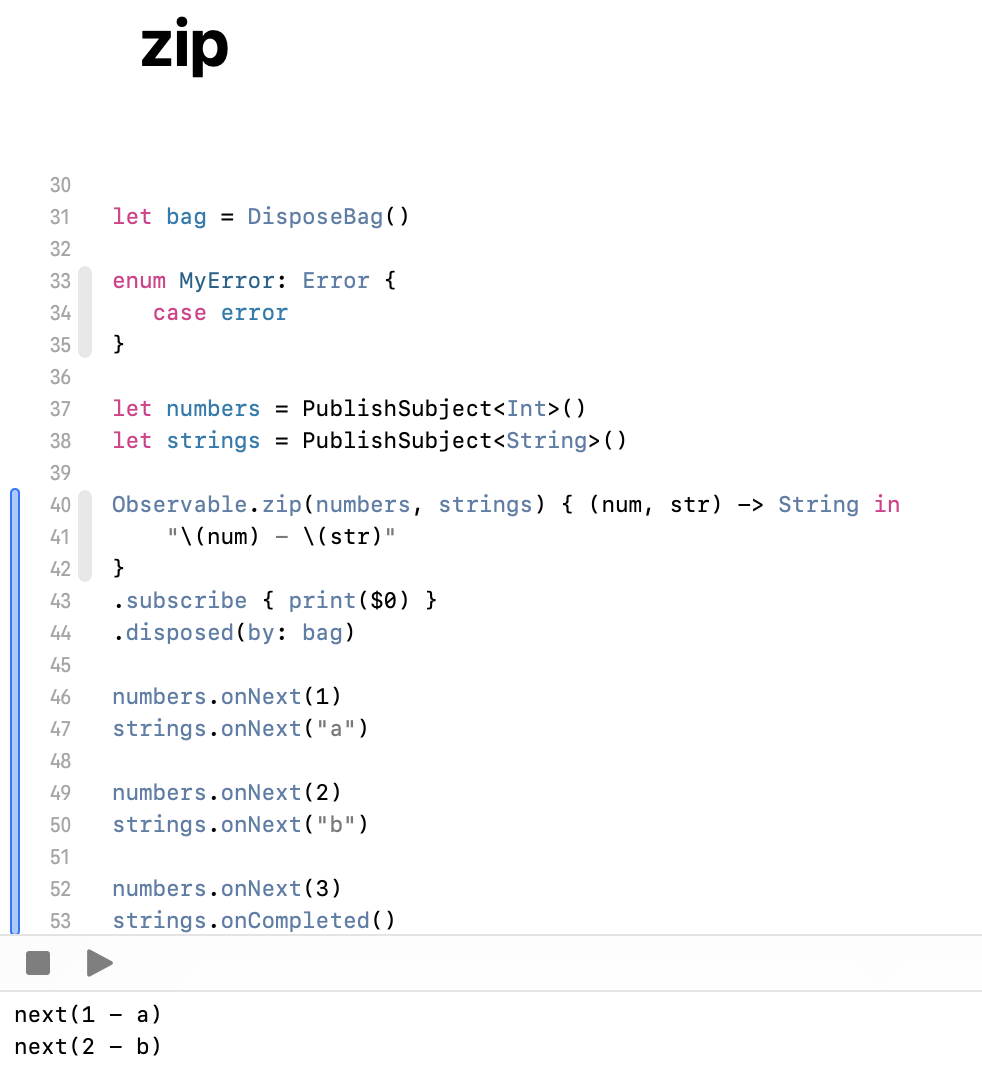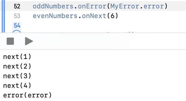 - 마찬가지로 zip에 참여한 옵저버블 모두 completed를 전달해야 종료되며, 하나라도 error이벤트 전달시 그 즉시 종료된다.