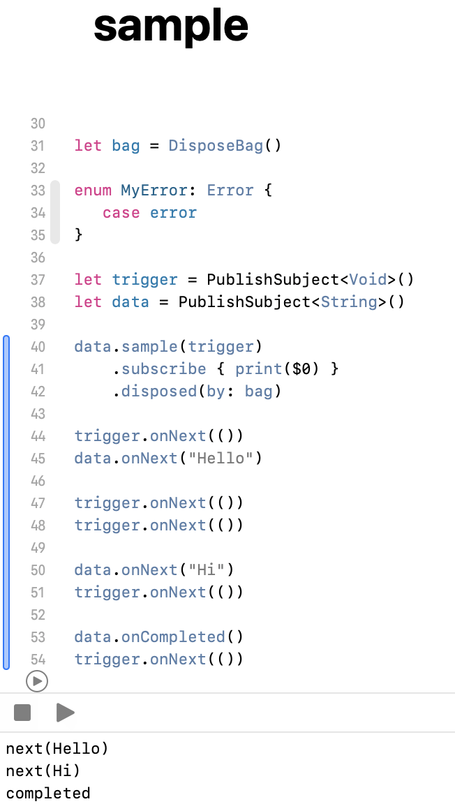 - 트리거 옵저버블이 Next 이벤트를 전달할 때마다 데이터 옵저버블이 Next 이벤트를 방출하지만, 동일한 Next 이벤트를 반복해서 방출하지 않는 연산자