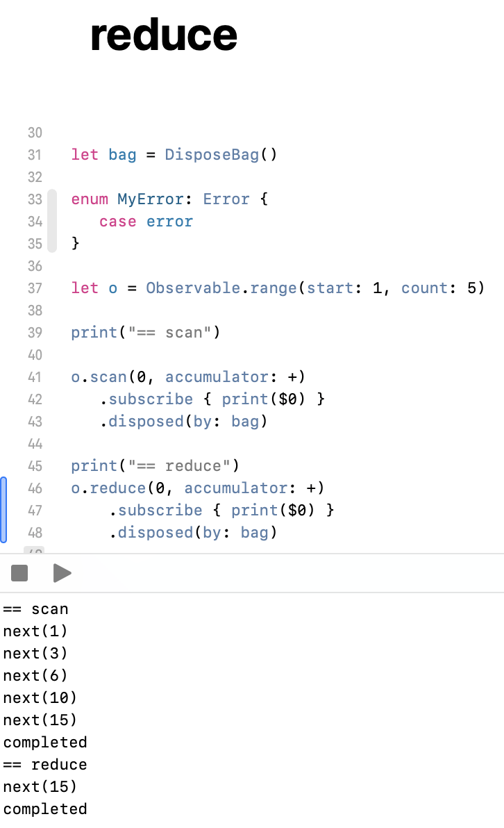 - 시드 값과 옵저버블이 방출하는 요소를 대상으로 클로저를 실행하고 최종 결과를 옵저버블로 방출하는 연산자