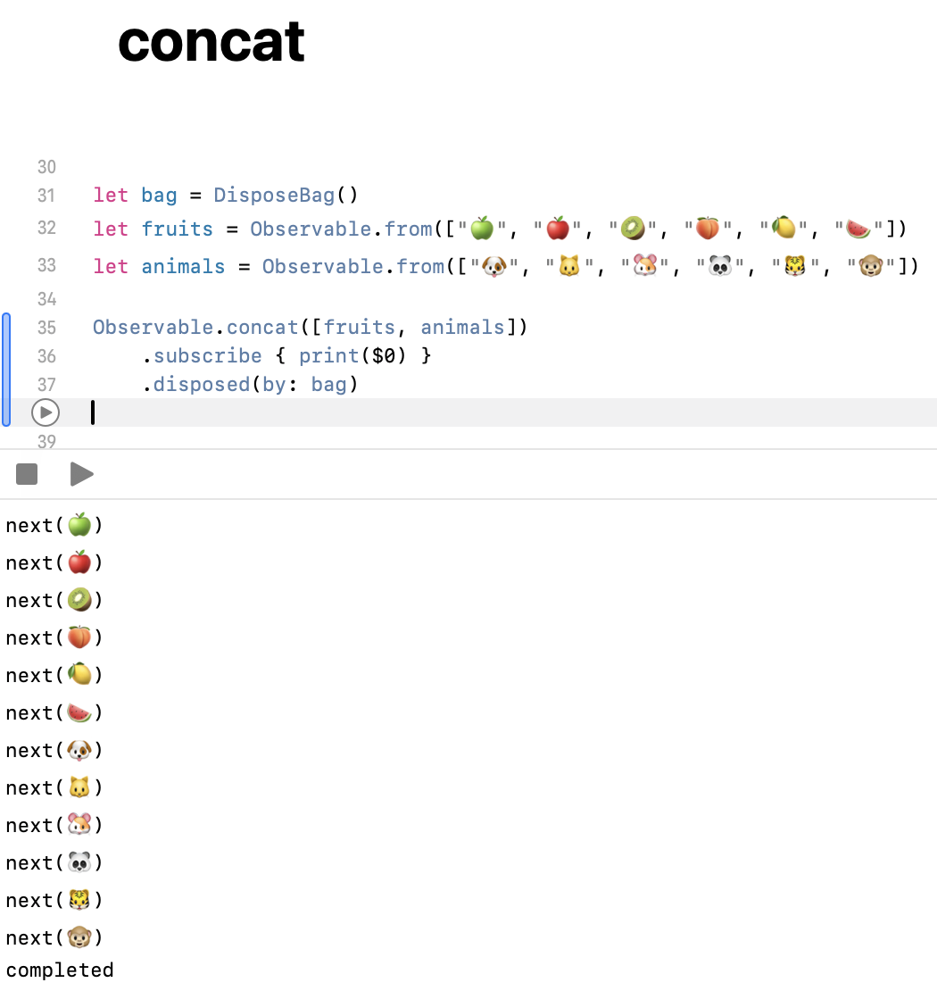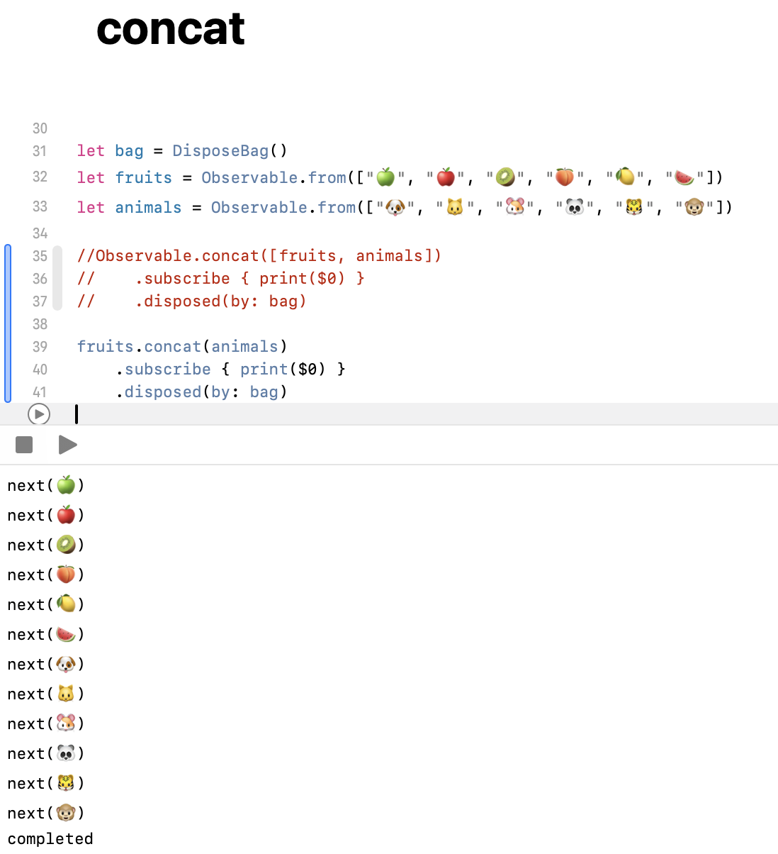 - 하나의 옵저버블이 모든 요소를 방출하고 completed를 전달하면 이어지는 옵저버블을 연결하는