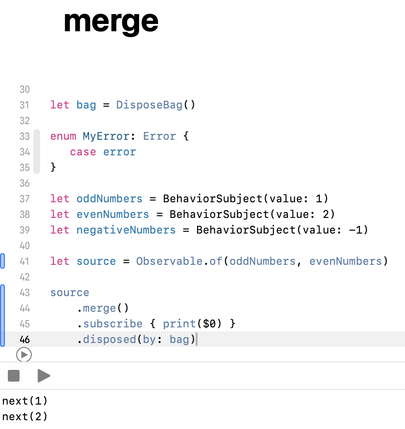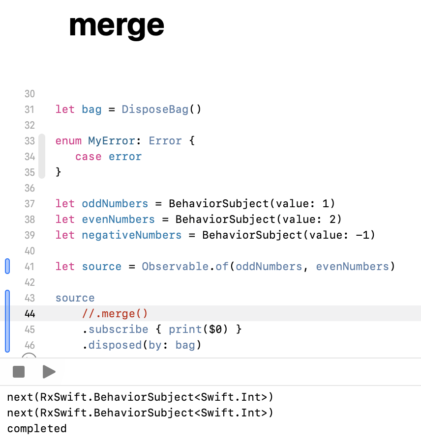 - 만약 2개로 제한했는데 3개의 옵저버블을 merge했을 때, 앞선 두 옵저버블 중 먼저 completed를 전달한 옵저버블을 제외하고 나머지 옵저버블이 merge대상에 포함된다.