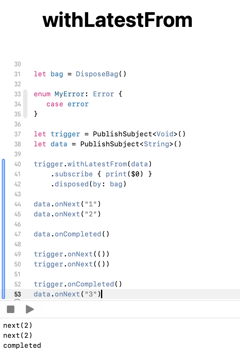 - 트리거 옵저버블이 Next 이벤트를 방출하면 데이터 옵저버블이 가장 최근에 방출한 Next 이벤트를 구독자에게 전달하는 연산자