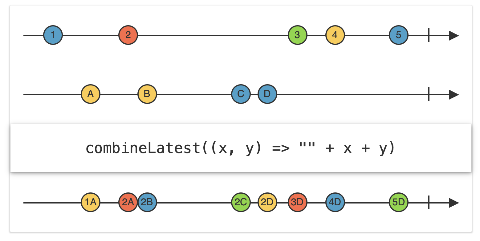 - 소스 옵저버블이 방출하는 최신 요소를 병합하는 연산자