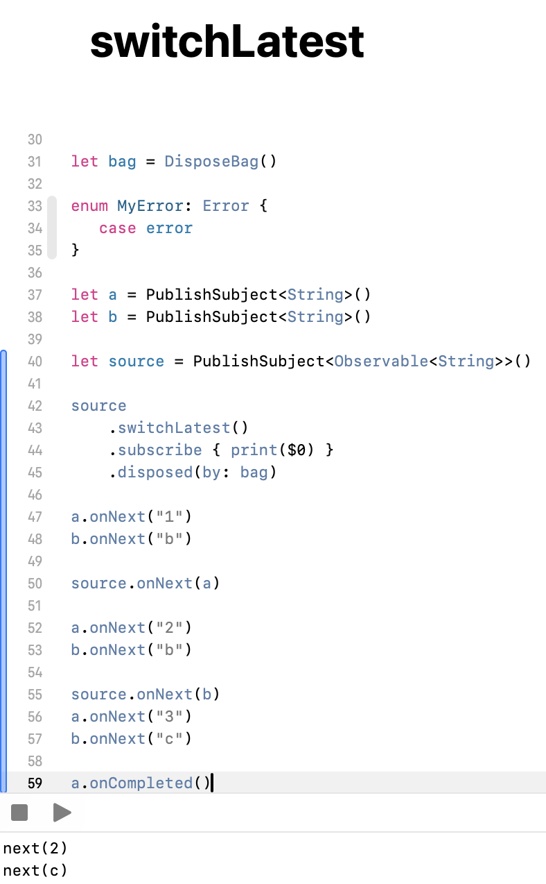 - 가장 최근에 방출된 옵저버블을 구독하고, 이 옵저버블이 전달하는 이벤트를 구독자에게 전달하는 연산자