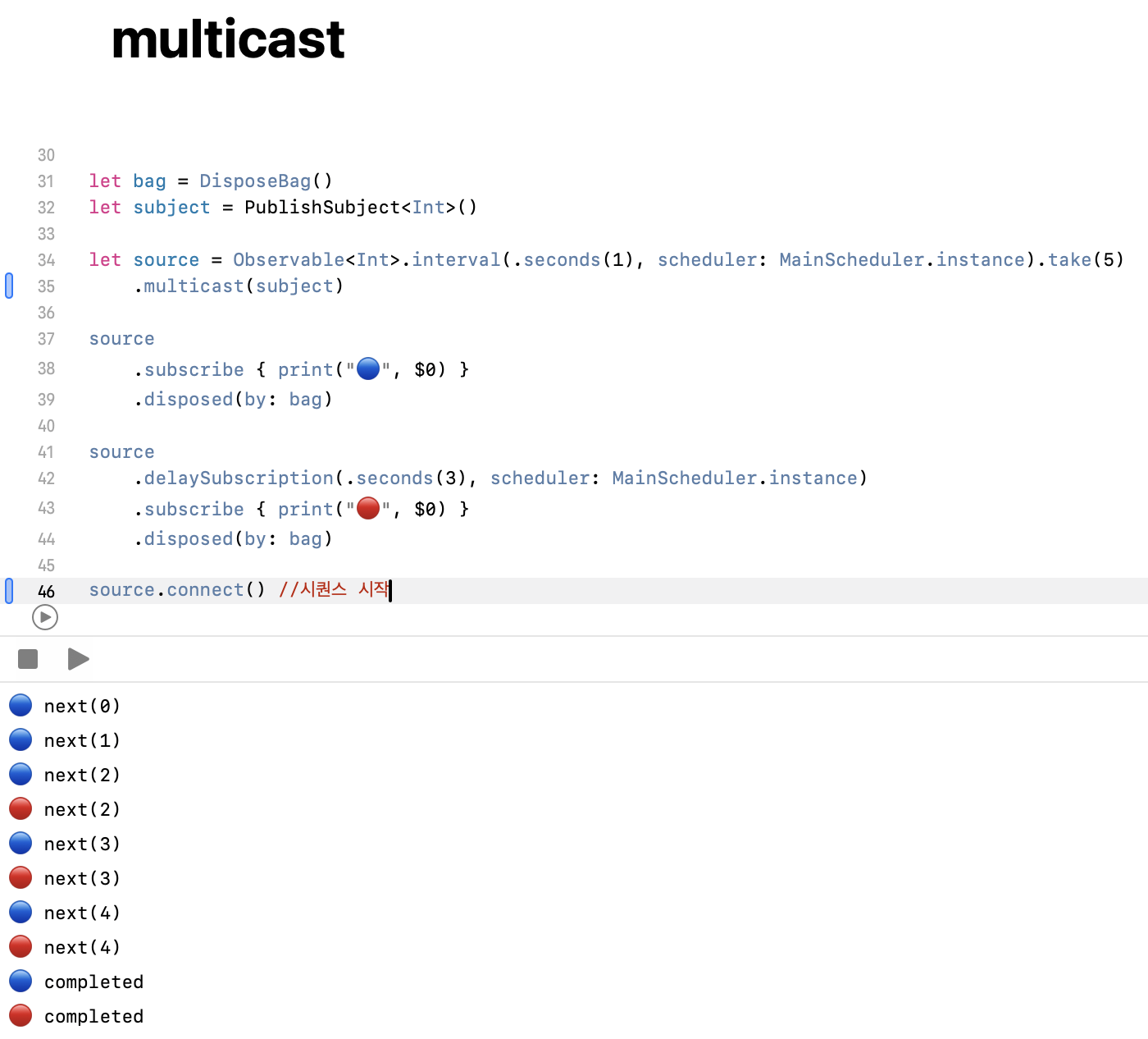 - 파랑, 빨강은 dispose 되기 전에 구독했기때문에 하나의 subject 공유 -> 빨강이 3부터 시작함