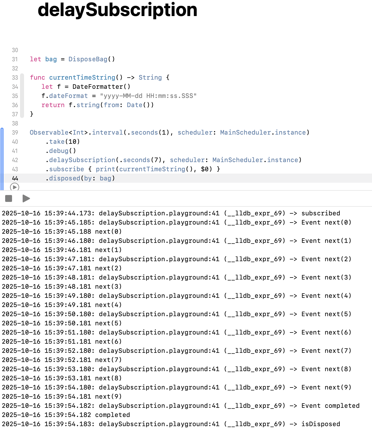 - 구독 시점을 지연시키기만 함, next이벤트가 전달되는 시점은 지연 X