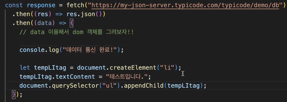이런식으로 사용하면 fetch는 비동기 방식이기 때문에 정보를 가져오는게 느려서 console.log를 먼저 찍어준다.