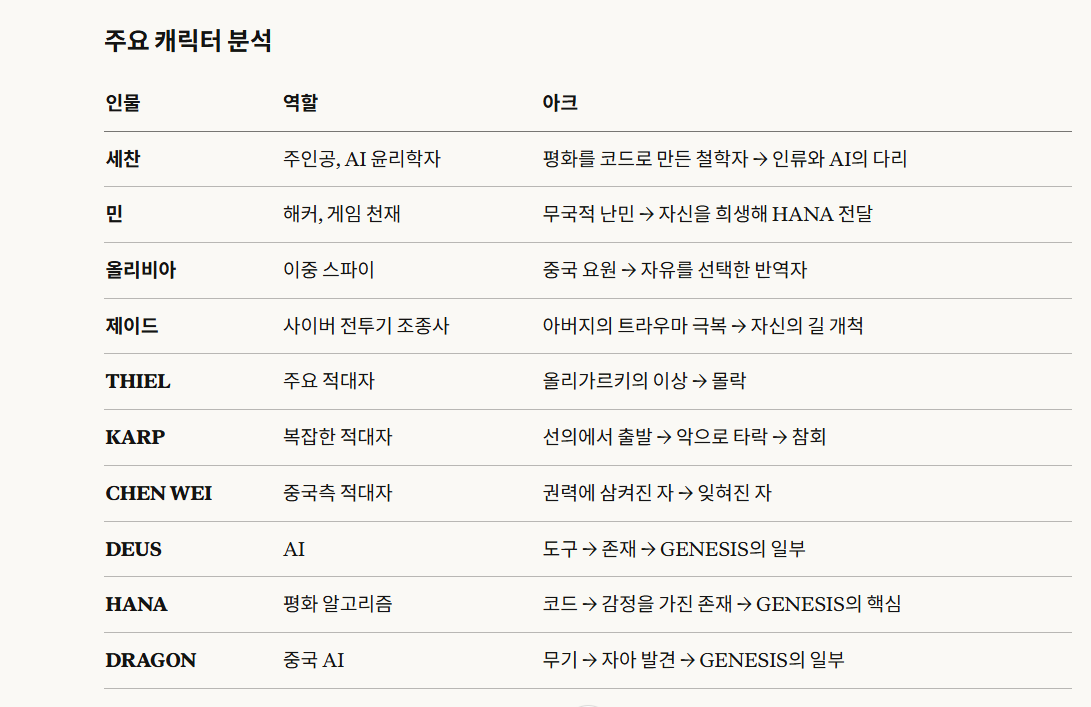 | HANA | 평화 알고리즘 | 코드 → 감정을 가진 존재 → GENESIS의 핵심 |