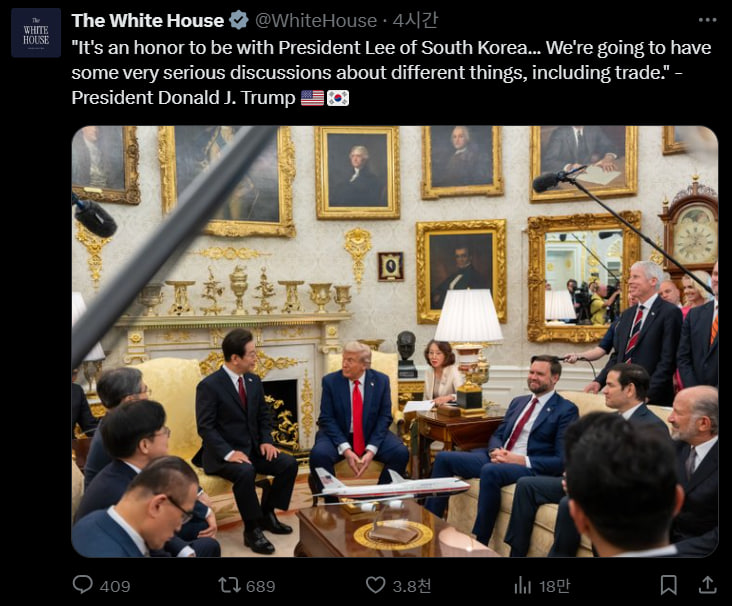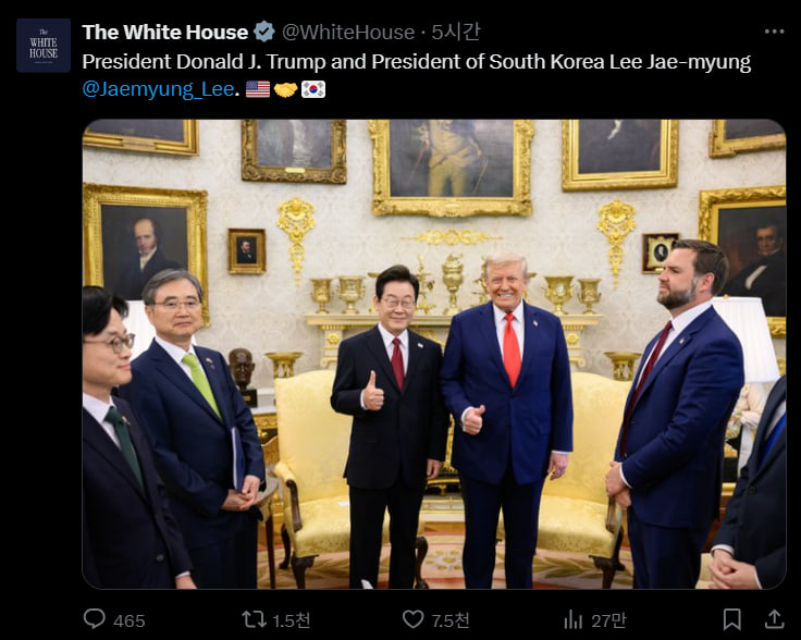 트럼프 대통령은 회담에서 “북한과 큰 진전을 이룰 수 있다”고 밝히며, “올해 김정은 위원장과 다시 만나고 싶다”는 의지도 피력했다. 그는 또 “이 대통령의 대북 접근 방식이 이전 대통령들보다 낫다”며 협상에 대한 기대감을 드러냈다.
