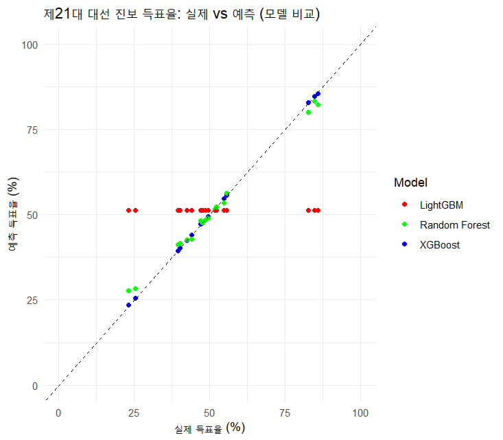 1. XGBoost 모델: 18~20대 데이터를 학습하여 21대 진보 득표율 예측.