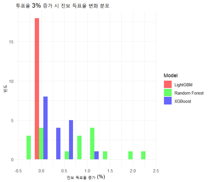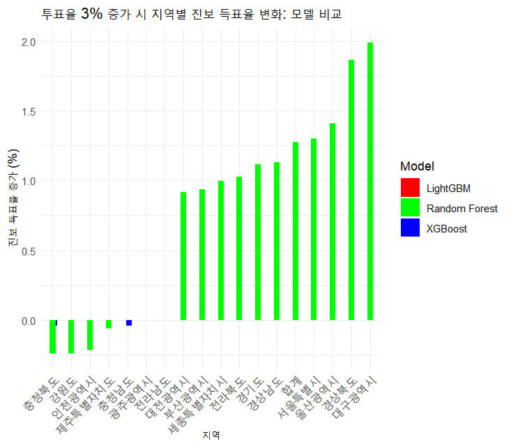 최적화.아래 R 코드는 데이터 전처리, XGBoost 학습, 투표율 3% 증가 시나리오 예측, 결과를 시각화.