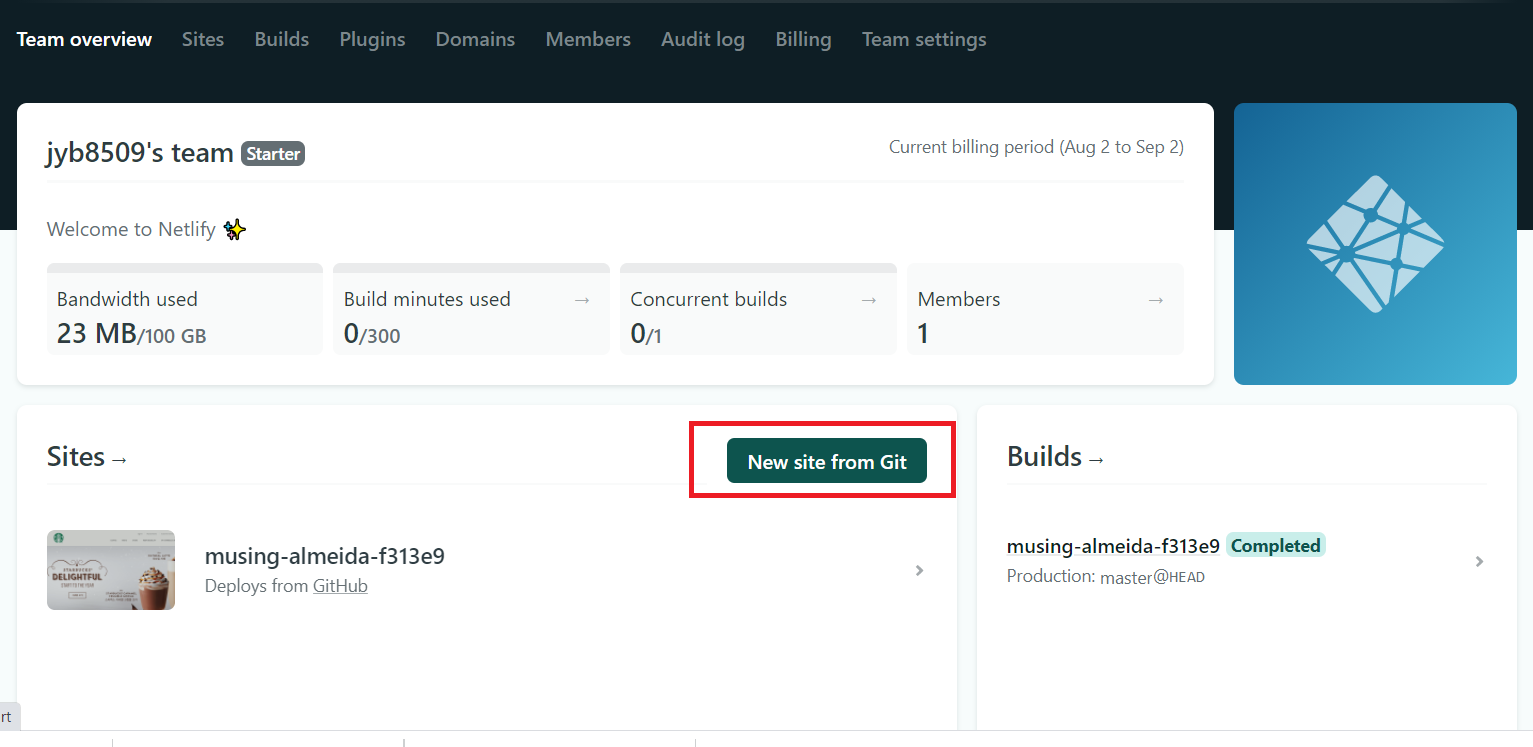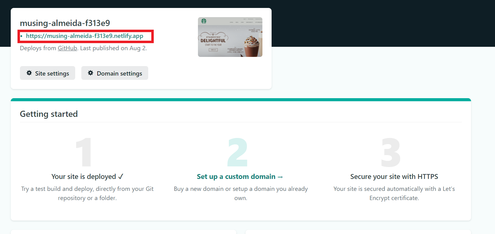 새로운 사이트를 만들 때 임의의 주소를 자동으로 만들어 주지만 커스텀 도메인도 설정할 수 있다고 한다.