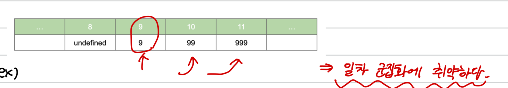인덱싱 해야할 공간이 비어있지 않으면, 한 칸씩 이동하여 빈 공간을 찾아나서는 방법이에요.