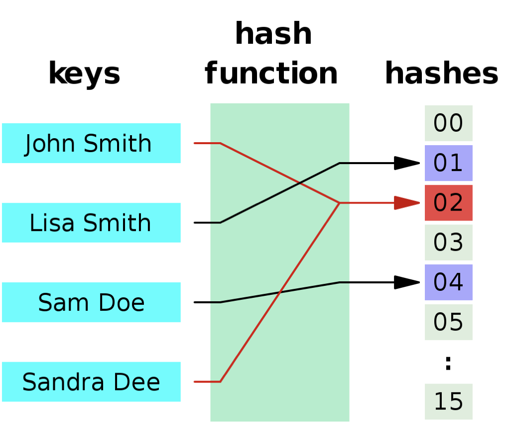 John Smith와 Sandra Dee가 같은 hash(버킷의 인덱스)에 접근하려다 꽝하고 충돌이 생긴것, 보이시나요!