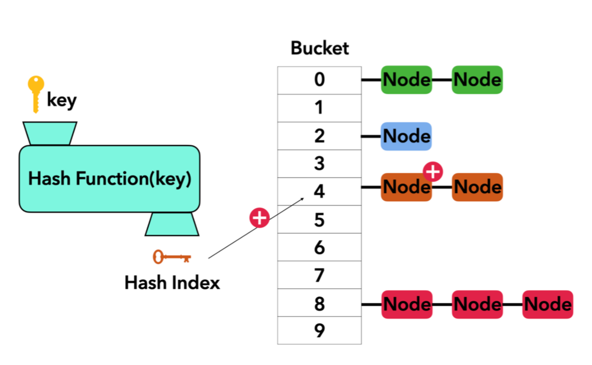 위 코드 블럭과 같이, key를 버킷 사이즈로 나눈 나머지가 buckey의 index가 되게 하는 방법이에요.
